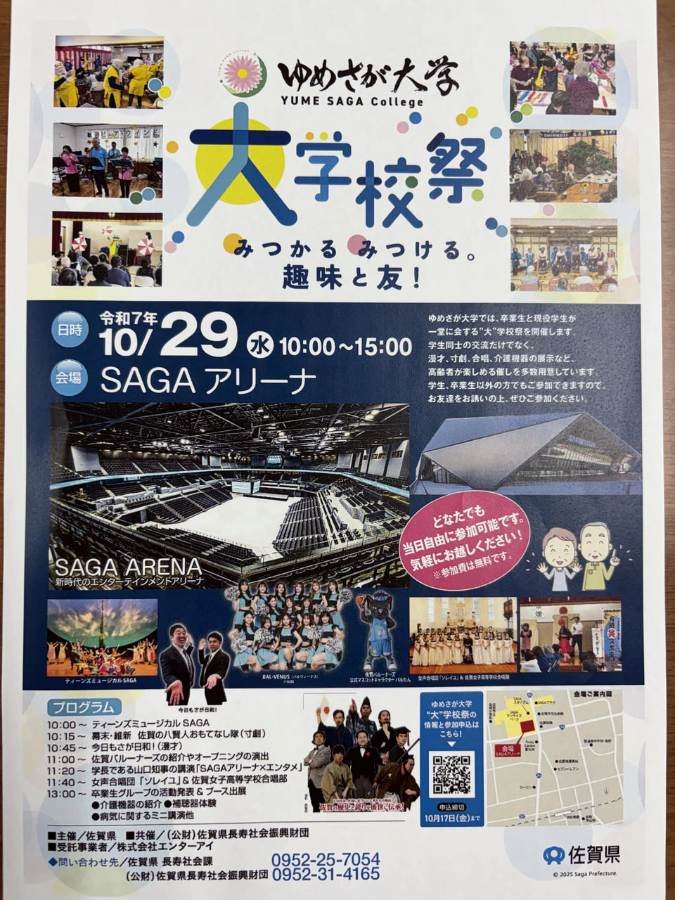 令和7年10月29日(水)10時~15時にSAGAアリーナにて、佐賀県(長寿社会課)主催でゆめさが大学"大”学校祭が開催されます。