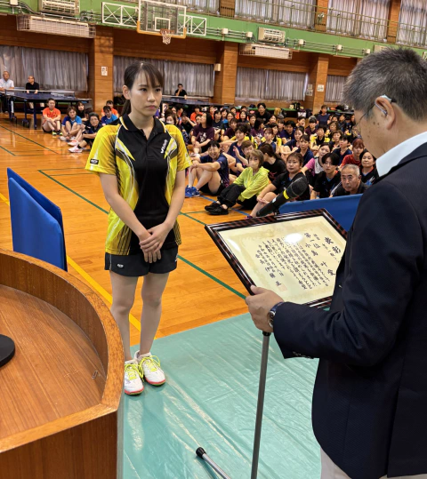 ◎開会式後に、今年8月に三重県で開催されました「第69回全国教職員卓球選手権大会」女子一般シングルスの部において、優勝されました小島叶愛選手、3位の小島悠夏選手の活躍に対しまして、佐賀県卓球協会より表彰を行いました。(悠夏選手は勤務先の小学校の運動会が終わり次第遅れて参加のため、表彰式は参加できませんでした。)